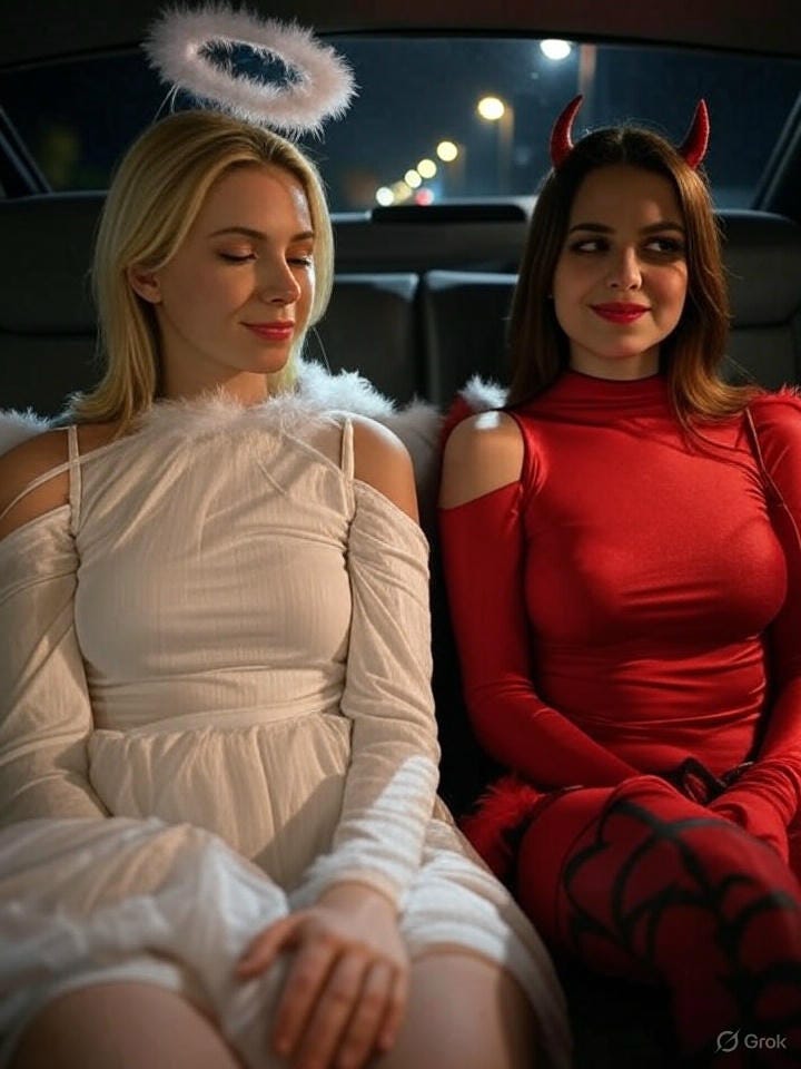 “Can you guess what our costumes are?” one of them asks, for some reason. One of them is an angel and one of them is a demon and it's obvious. A four-year-old could guess it.