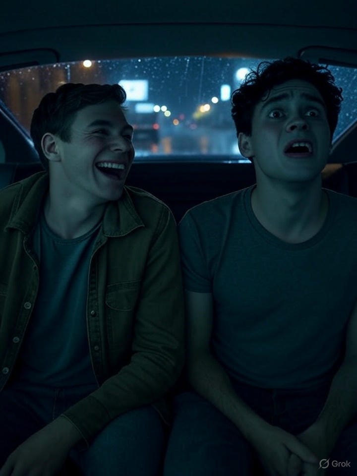 Scared Guy hasn't seen many horror movies, or he’d know that Funny Guy almost always dies before Scared Guy, and since Scared Guy is in a car with two Funny Guys and there's no woman here to be Final Girl, his odds are actually really good.